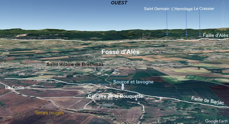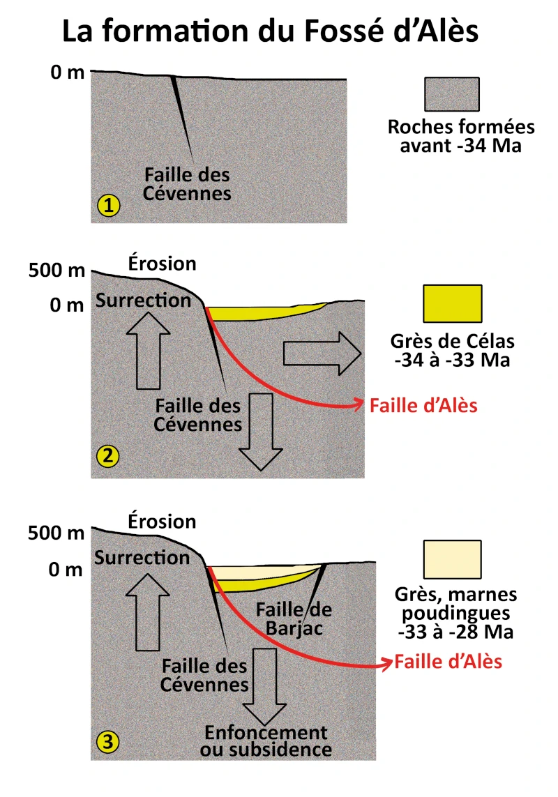 Ce fossé est limité à l’ouest par la faille d’Alès et à l’est par la faille de Barjac (Fig.2). Il résulte d’une période de distension ou d’étirement qui a fracturé les roches en place à partir de -35 à -34 millions d’années. (Fig.2)