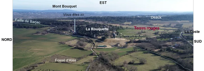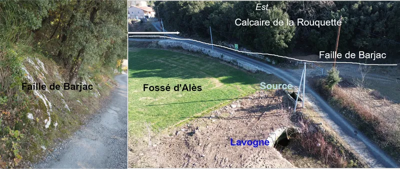 La source du village et une lavogne à moutons se situent au pied de la faille de Barjac, au-dessous du massif calcaire de la Rouquette. (Fig.3 et 4)