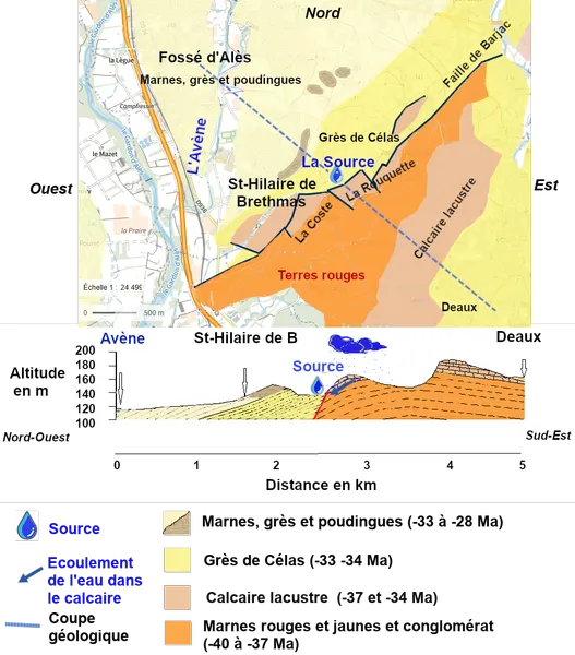 L’eau de pluie s’infiltre dans les fissures du calcaire lacustre et s’écoule par gravité vers la faille. Au niveau de la faille de Barjac, elle ressurgit sur les grès imperméables de Célas en raison de la présence de marnes, qui sont des roches composées d’argiles. (Fig.5)