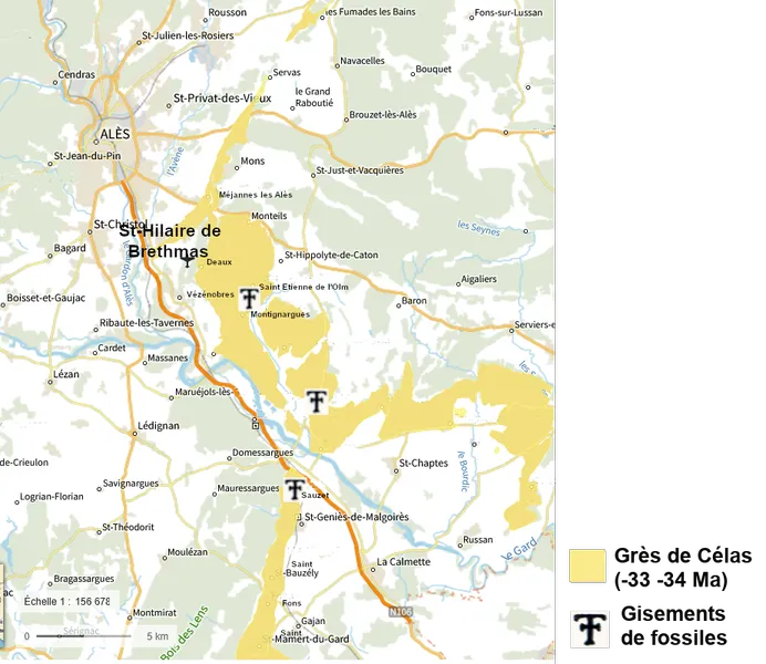 Puis la faille listrique d’Alès (en forme de pelle) a provoqué le décollement des roches de la bordure cévenole, entraînant leur glissement. Un demi-fossé s’est constitué, et des sédiments détritiques (galets, sable, argile) se sont déposés au fur et à mesure de son enfoncement formant aujourd’hui les assises de Célas (2). Cette formation de Célas ou de Sauzet, couvre une large surface entre Monteils et Saint Bauzély, elle est formée de grès, de marnes sableuses verdâtres ou jaunâtres avec des intercalations de couches de poudingues[1]. Ces roches contiennent de nombreuses empreintes de végétaux mais aussi quelques fossiles isolées de mammifères. Les fossiles de cette flore et faune témoignent encore d’un climat chaud et humide. Au Musée Garimont à Fons, on peut observer les éléments fossilisés du grès de Célas ou de Sauzet.