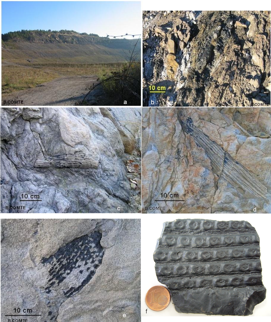 Fig.7 Bassin houiller du Pontil (a : La carrière, b : Veine de houille redressée à la verticale, c et d : Fossiles de troncs de calamites, e et f : écorce fossile de sigillaire)