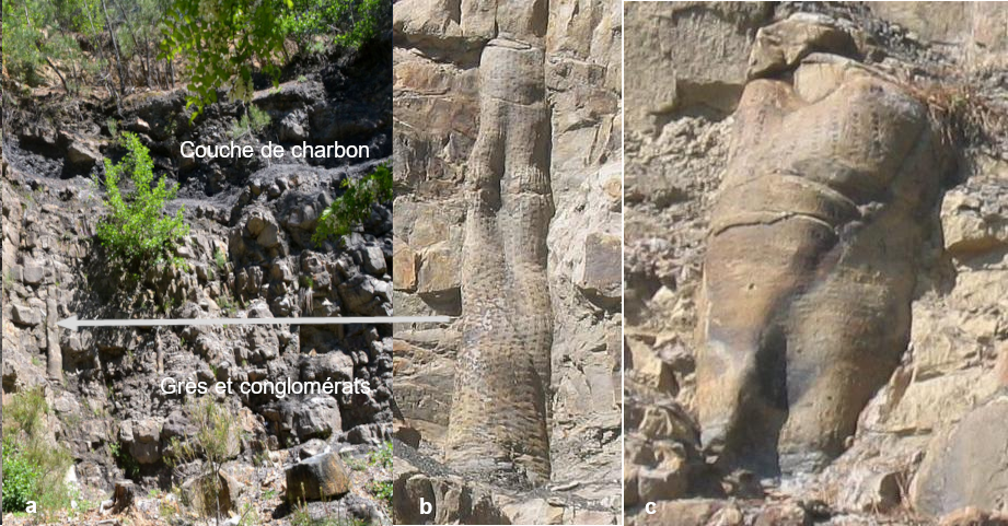 Fig.6 : Tranchée d’exploitation du charbon à Champclauson (a), tronc de sigillaire et racine fossilisés (b etc). Photographies issues de la lithothèque de Montpellier.