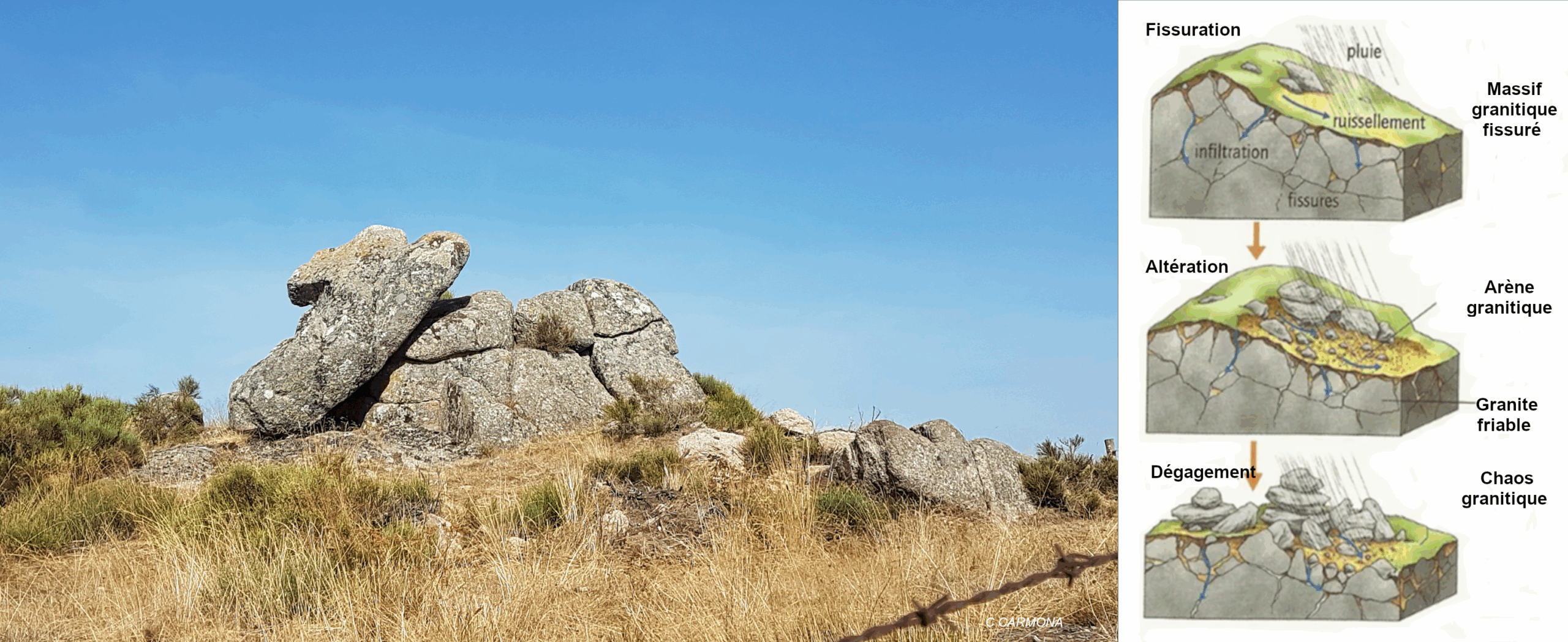 Fig.4 Chaos granitique appelé « le lapin » à Grizac massif du Mont Lozère et schéma de la formation des chaos.