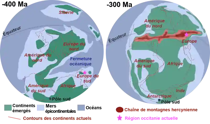 L’explication de la formation de cette chaîne de montagnes repose sur le déplacement des plaques lithosphériques. La fermeture des océans entre -420 et -320 millions d’années a engendré les collisions continentales qui ont conduit à la formation de la chaîne de montagnes hercynienne (Fig.9), aussi élevée que l’Himalaya actuel(Fig.11). Le Massif central se trouvait au sud de cette chaîne. Par la suite, cette chaîne de montagnes a connu un affaissement et une érosion (Fig.10).