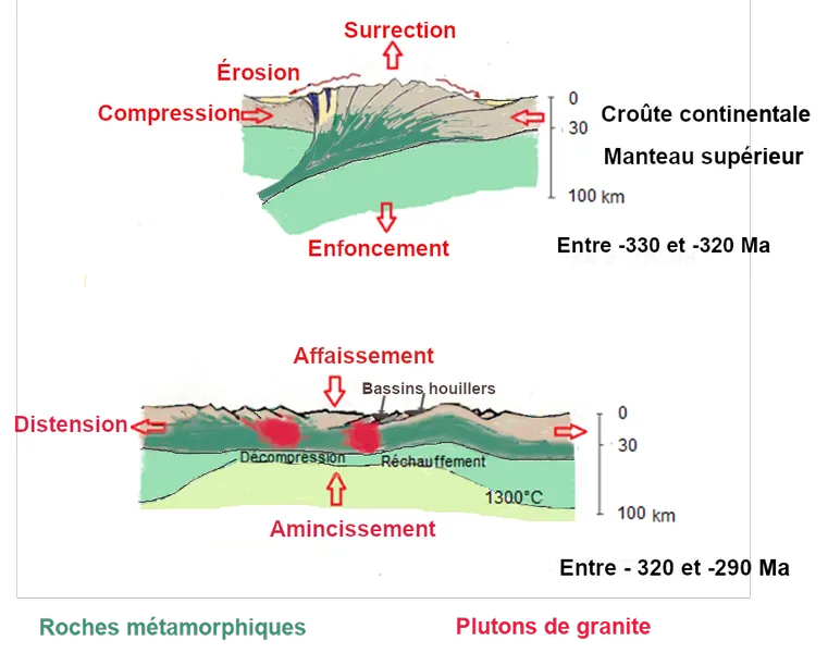 Fig.10 : schémas de la formation puis de l’effondrement de la chaîne de montagnes hercynienne