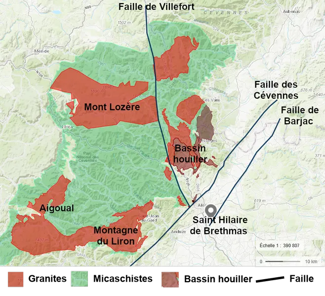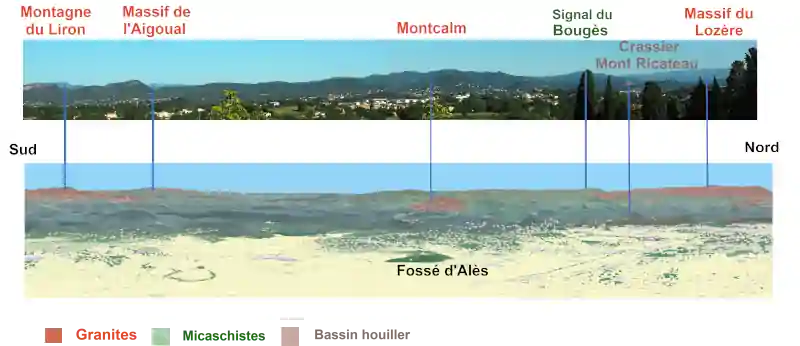 Les roches formées en profondeur, granites, micaschistes, charbon, dans la chaîne montagneuse hercynienne sont aujourd’hui à l’affleurement (Fig.12). Dans la bordure Cévenole, elles sont recouvertes par des couches d’autres roches formées au cours de l’arrivée puis de l’installation d’une mer chaude et peu profonde . Cela signifie que cette chaîne de montagnes s’est complètement affaissée, érodée puis elle a été recouverte par une mer et, ensuite, elle a subi plusieurs phases de surrections et d’érosion . Ces roches, granites et micaschistes forment le socle, il est présent à une profondeur de 2 000 m sous notre commune.