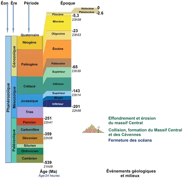 Fig.1 L’échelle des temps géologiques en millions d’années situant la formation et l’érosion des Cévennes