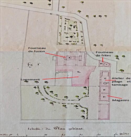 Après une enquête commodo et incommodo[16], en août 1822, Anne-Marie Castelviel reçoit l’autorisation de construire une verrerie à Larnac. C’est le roi Louis XVIII, un peu moins tête en l’air que son frère Louis XVI, qui signe l’autorisation de construire une verrerie, le 14 août 1822 avec l’obligation de « n’alimenter la dite usine qu’avec de la houille, sans pouvoir y employer du bois ». Sur le site du patrimoine de l’État, le bâtiment est précisé achevé en 1835 et 1836[17]. Néanmoins, nous avons vu à quel point les informations y figurant devaient être vérifiées.